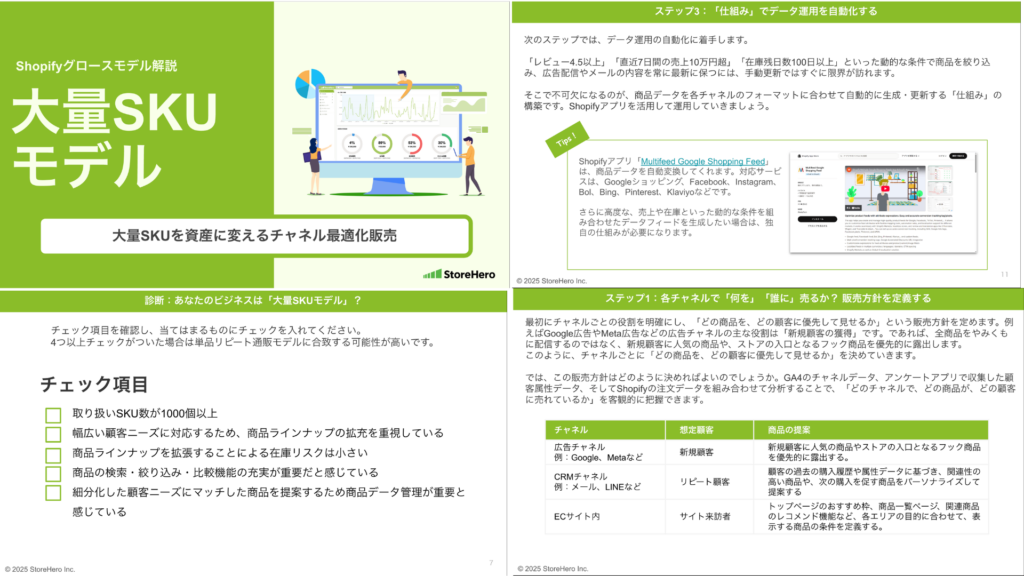 本資料では、Shopifyグロース支援専門のStoreHeroが、数千〜数万規模のSKUを効率的に管理し、収益を最大化させる「大量SKUモデル」のグロース戦略を公開します。各販売チャネルの役割に応じた商品出し分けの方針定義から、AI広告の学習を加速させるデータグルーピング、そしてShopifyアプリや独自プラットフォームを活用したデータ運用の自動化手法までを徹底解説。