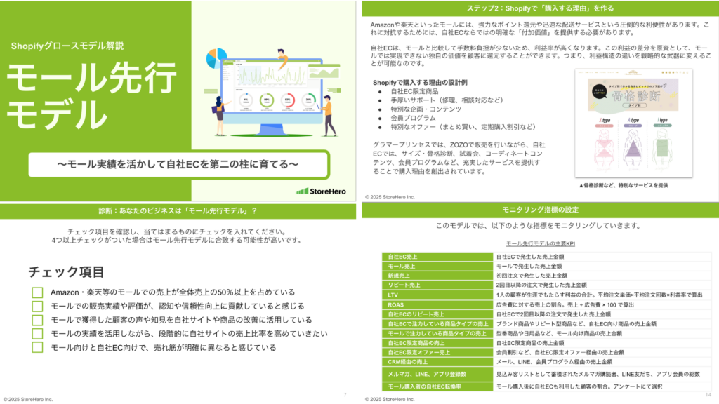本資料では、Shopifyグロース支援専門のStoreHeroが、モールでの販売実績や社会的証明を最大限に活用し、Shopify自社サイトを劇的に成長させる「モール先行モデル」の勝ち筋を徹底解説します。モールと自社ECで「売るべき商品」をどう分けるのか、規約を遵守しながらいかに自社サイトへ誘導し顧客リストを資産化するのか。