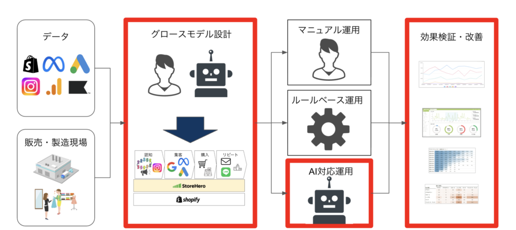 StoreHeroは、現場のグロースパートナーがShopifyマーチャントとの対話から抽出した「現場の一次情報(顧客が購入を決めた『生の声』、ベテラン販売員だけが知る『接客の勘所』など)」を構造化してAIに学習させることで、ブランドを深く理解した動きをする「Shopifyグロース特化型AIエージェント(StoreHero AI)」を開発しました。これにより、単なる効率化ではなく、「成功再現性の高いグロース運用」を実現します。
