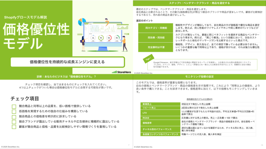 本資料では、Shopifyグロース支援専門のStoreHeroが、競合と同等以上の品質を維持しながら圧倒的な価格優位性でシェアを奪う「価格優位性モデル」の戦略を公開します。単なる安売りではなく、ベンチマークが獲得している顧客接点に意図的に露出する「コバンザメ戦略」から、多角的な提案コンテンツでLTV(顧客生涯価値)を最大化させる具体的な5ステップを徹底解説。