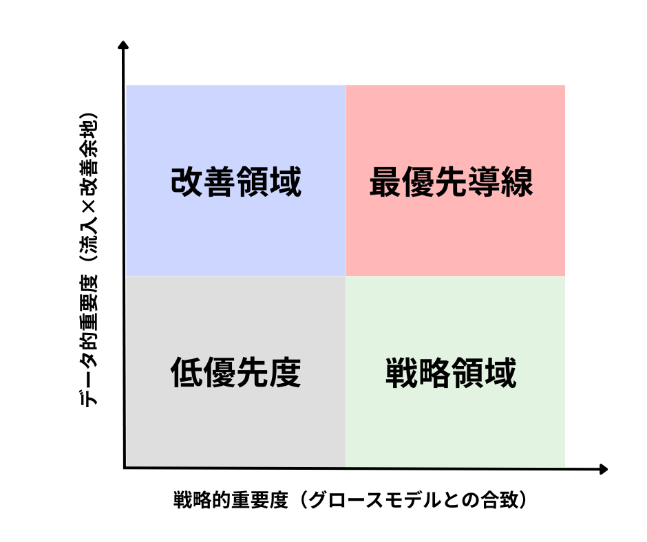 フェーズ1で得たデータをもとに、改善インパクトの大きい優先導線を特定します。優先導線の決定には、2つの軸を使います。