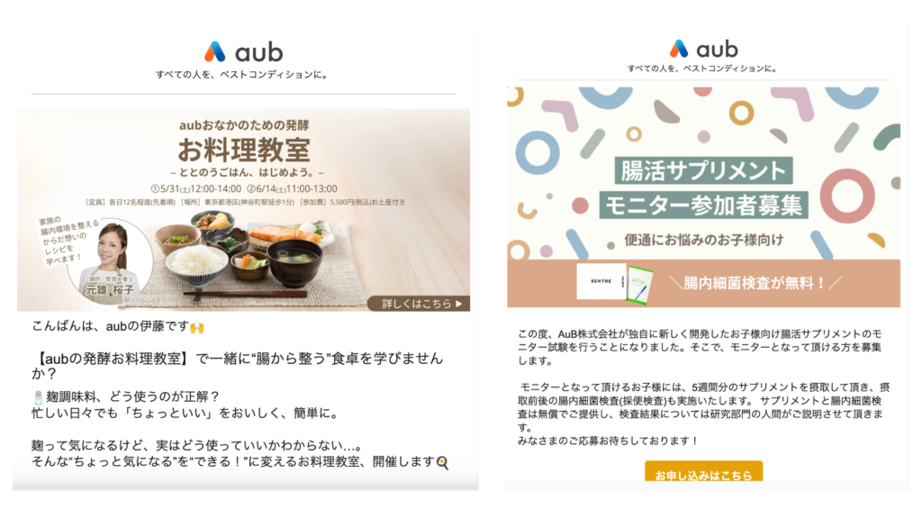 リピート購入促進のメールでは、商品紹介はもちろん行いますが、Shopify(自社EC)ならではの付加価値をしっかり伝えることが大事です。先程紹介したAuB様のメールでは、腸活に関するノウハウや会員向けサービスをしっかり紹介されています。