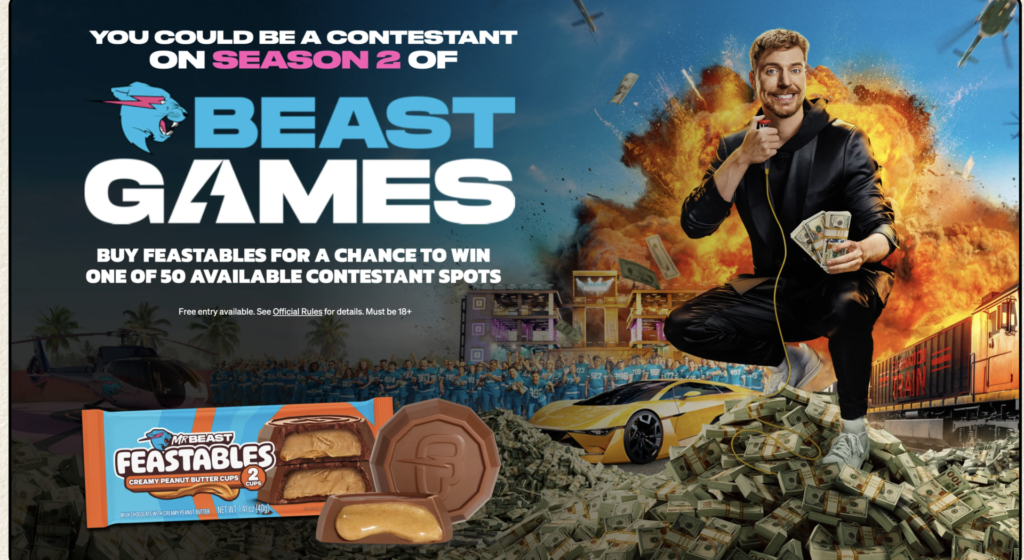 例えば、自社の商品(チョコレート)を、彼のYouTubeチャンネルやAmazon Prime Videoで配信される大規模リアリティ番組「Beast Games」シーズン2への「応募券」になるというキャンペーンを実施しました。