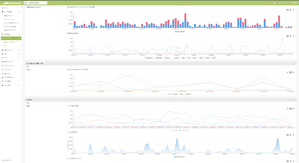 StoreHeroの支援先では、Shopify、GA、広告媒体、サーチコンソールなどのデータを統合してモニタリングできるダッシュボードを構築し、迅速な意思決定に役立てています。