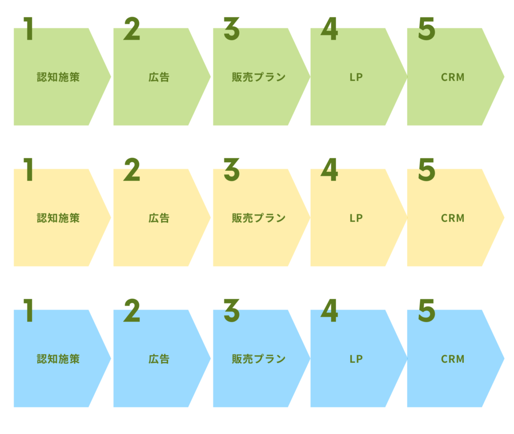 LTV/CPAが非常に高い「勝ちパターン」の組み合わせを見つけたとしても、いずれ市場が枯渇し、獲得効率が悪化してくる可能性があります。そのような状況に陥る前に、新しい市場を開拓する必要があります。新しい市場を開拓するためには、新しい「認知・広告・販売プラン・LP・CRM」の組み合わせが必要になります。