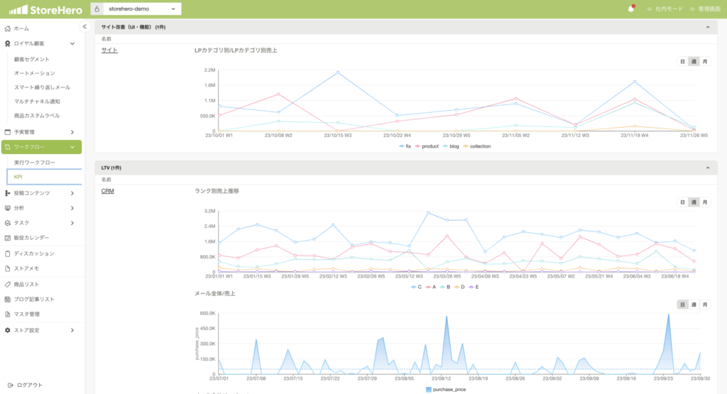 モニタリング対象が、Shopifyサイト内、SNS、CRMチャネルなど、多岐にわたるため、各ツールからデータを拾っていると非効率です。StoreHeroの場合、ツール横断のダッシュボードを作成してモニタリングして、状況判断ではなく対策に時間が使えるようにしています。