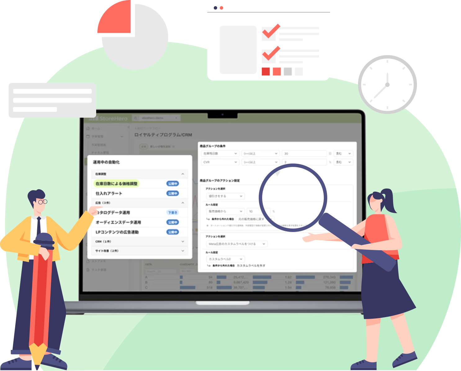 顧客・商品・在庫・チャネルの観点からShopifyストアの成長課題を可視化します。ShopifyのレポートやGAでは集計するのが難しい“大事な課題”が分かります。